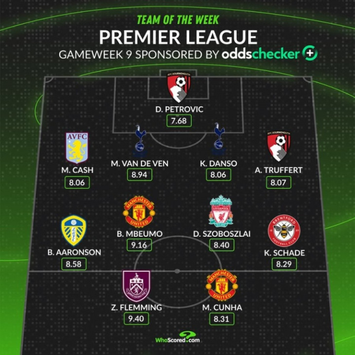 直播吧10月27日讯英超联赛第9轮已经完赛,whoscored也列出了本轮英超评分最佳阵,曼联、热刺和伯恩茅斯各2将入围。